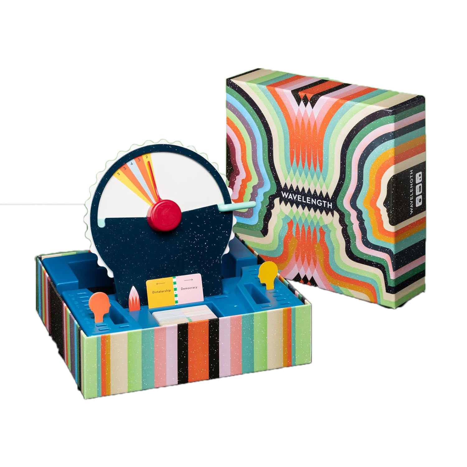 Wavelength is a social guessing game in which two teams compete to read each other’s minds. Teams take turns rotating a dial to where they think a hidden bullseye is located on a spectrum. One of the players on your team — the Psychic — knows exactly where the bullseye is, and draws a card with a pair of binaries on it (such as: Job – Career, Rough – Smooth, Fantasy – Sci-Fi, Sad Song – Happy Song, etc). The Psychic must then provide a clue that is *conceptually* where the bullseye is located between those two binaries.